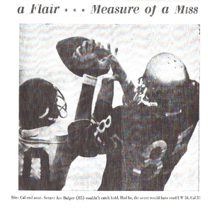 For whatever reasons, for Husky football fans, that game and one dropped pass stuck in their memory for decades. It was over thirty years later in the early 2002 or 2003 where I attended a small private wedding in Seattle in the Smith Tower, when I was standing in the reception line to meet the District Court Judge who had just performed the wedding ceremony. When I introduced myself he gasped and said, “Ace Bulger! I have been wondering about how you have been doing ever since the California Game!” This is just one example: It would be difficult for me to remember how many times people who are complete strangers to me have brought up that dropped pass as soon as I told them my name.